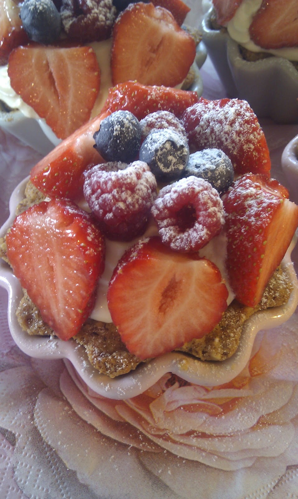 Tips: Jeg blandet vaniljekrem med den piskede kremen, da får du en litt lettere kremsmak til bærene.. mmm... I etterkant så tror jeg at jeg også skal bruke en vanlig "ostekake" bunn i stedet for de nøtte bunnene... det ble litt mektig! Men knust Digistive kjeks, smør og sukker... gir en lettere bunn.. mmm
