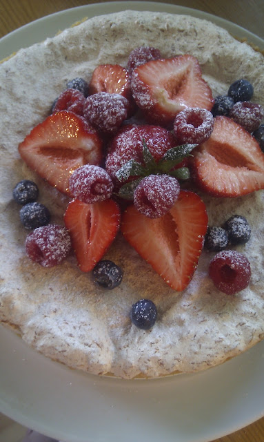Pynt så kaken med sesongens frukt og bær.. jeg bruker ofte kiwi og jordbær... men denne gangen ble det blåbær, bringebær og jordbær... ekstra lekkert blir det om du drysser litt melis oppå bærene.